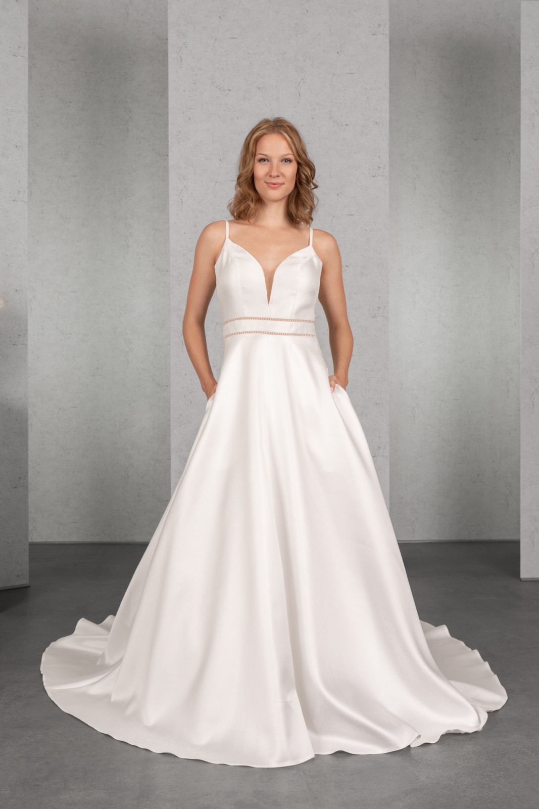 Das puristische Brautkleid aus Glitzer-Piqué lässt jede Braut strahlen. Das schlichte Top mit Cut-Out und tiefem Rücken wird durch schmale Träger gekonnt in Szene gesetzt, eine zarte Spitzenborte betont die Taille. Der weite Rock rundet den Look gekonnt ab.