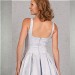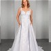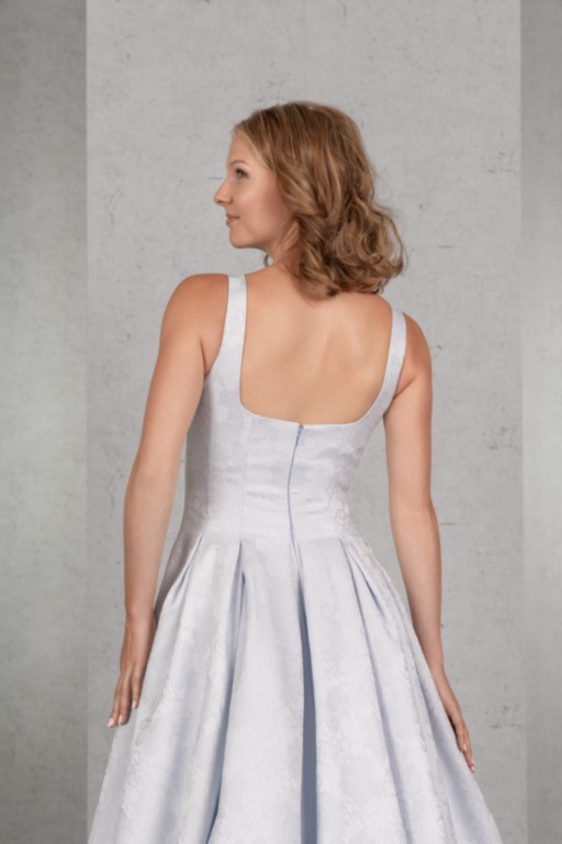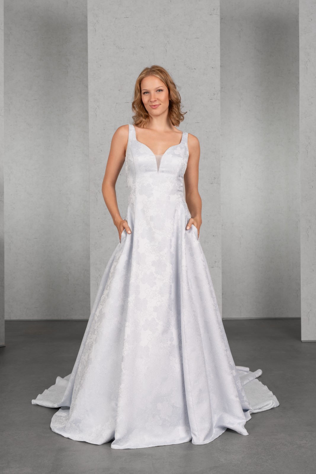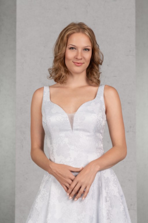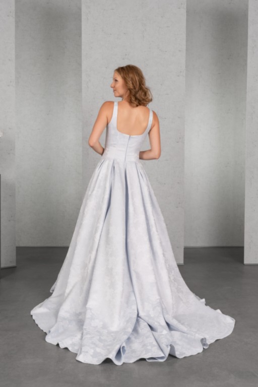 Das Top mit Trägern, kurzem Cut-Out und normaler Rückenhöhe geht fließend über in den weiten Rock mit tiefen Kellerfalten, Seitentaschen im Rock sorgen für Lässigkeit. Der ausdrucksstarke Jacquard bringt den raffinierten Schnitt des Brautkleides gekonnt zur Geltung.