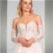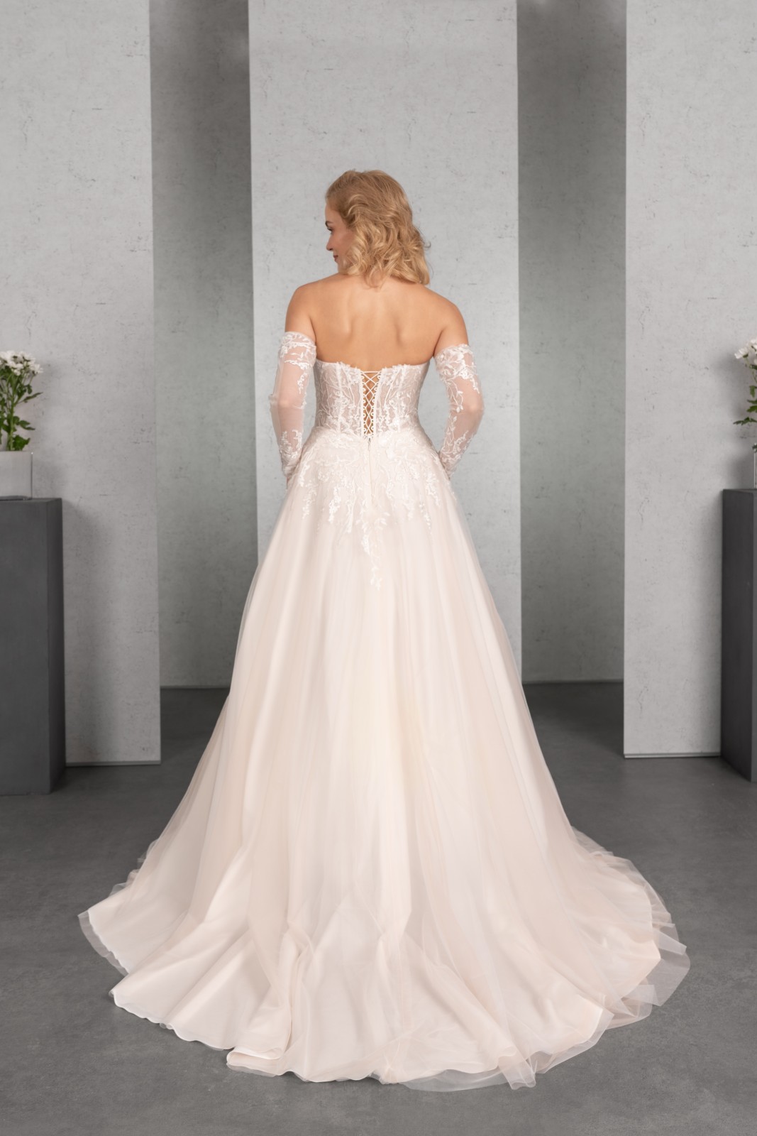 Das transparente Top mit taillentiefem Cut-Out und sichtbaren Stäbchen ist aufwendig mit perlenbestickter Spitze besetzt. Die abnehmbaren langen Ärmel und der geschnürte Rücken sind ein besonderer Blickfang, der weite Tüllrock vervollständigt das romantische Brautkleid perfekt.