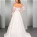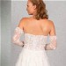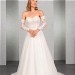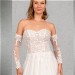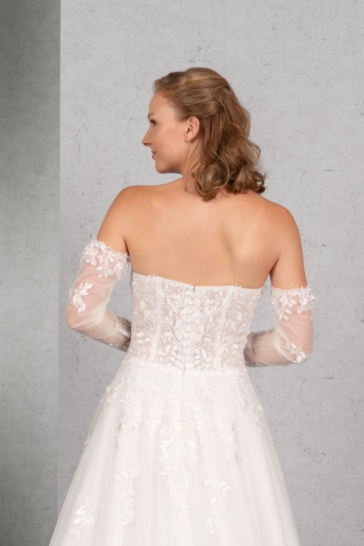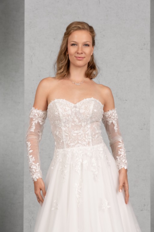 Das transparente Top ist mit Paillettenspitze unterlegt und aufwendig mit blätterförmiger Spitze besetzt, die sich auf der Schleppe des weiten Tüllrocks wiederholt. Die abnehmbaren langen Ärmel vervollständigen das romantische Brautkleid perfekt.