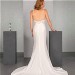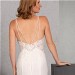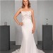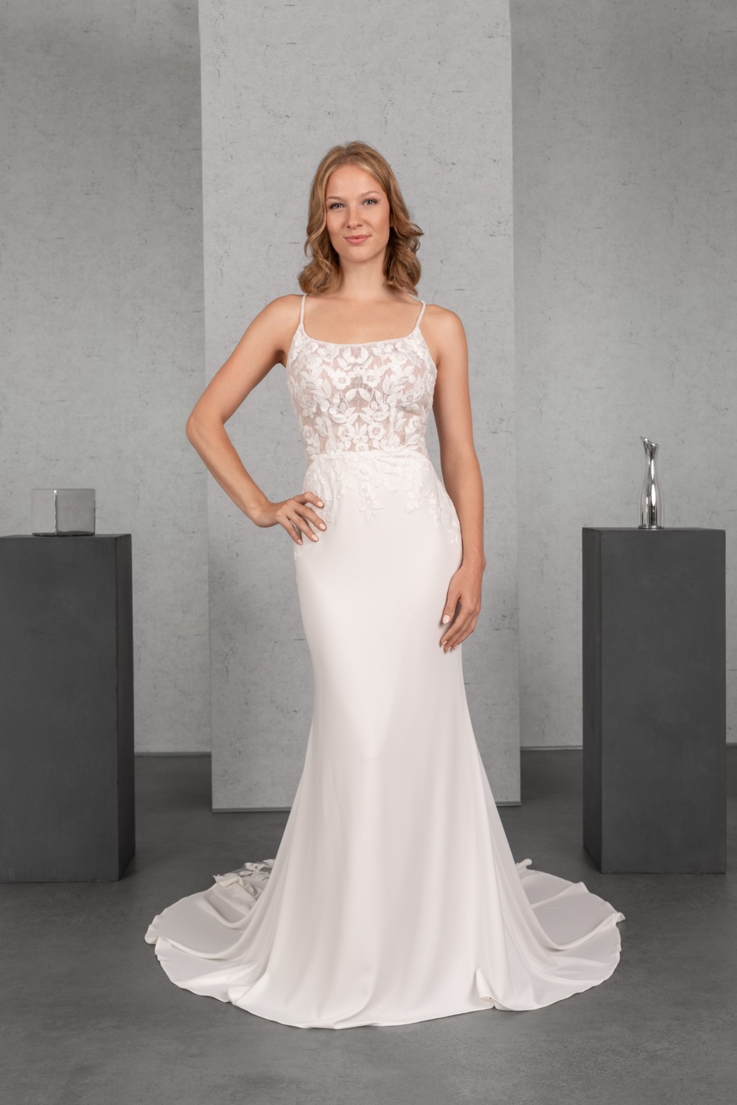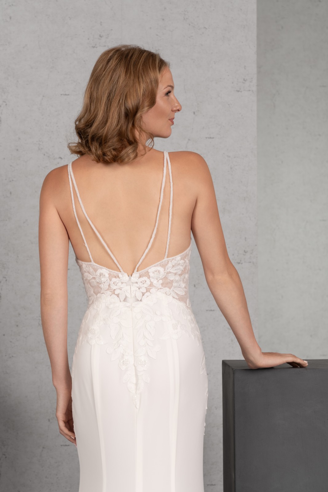 Die Blätter und Blüten der Spitze dominieren das Top mit geradem Ausschnitt und tiefem Rücken, die perlenbestickten Träger unterstreichen die zarte Ausstrahlung. Der schmale Rock aus Crêpe endet in einer umwerfenden Schleppe mit Tülleinsatz und aufwendiger Spitzenapplikation.
