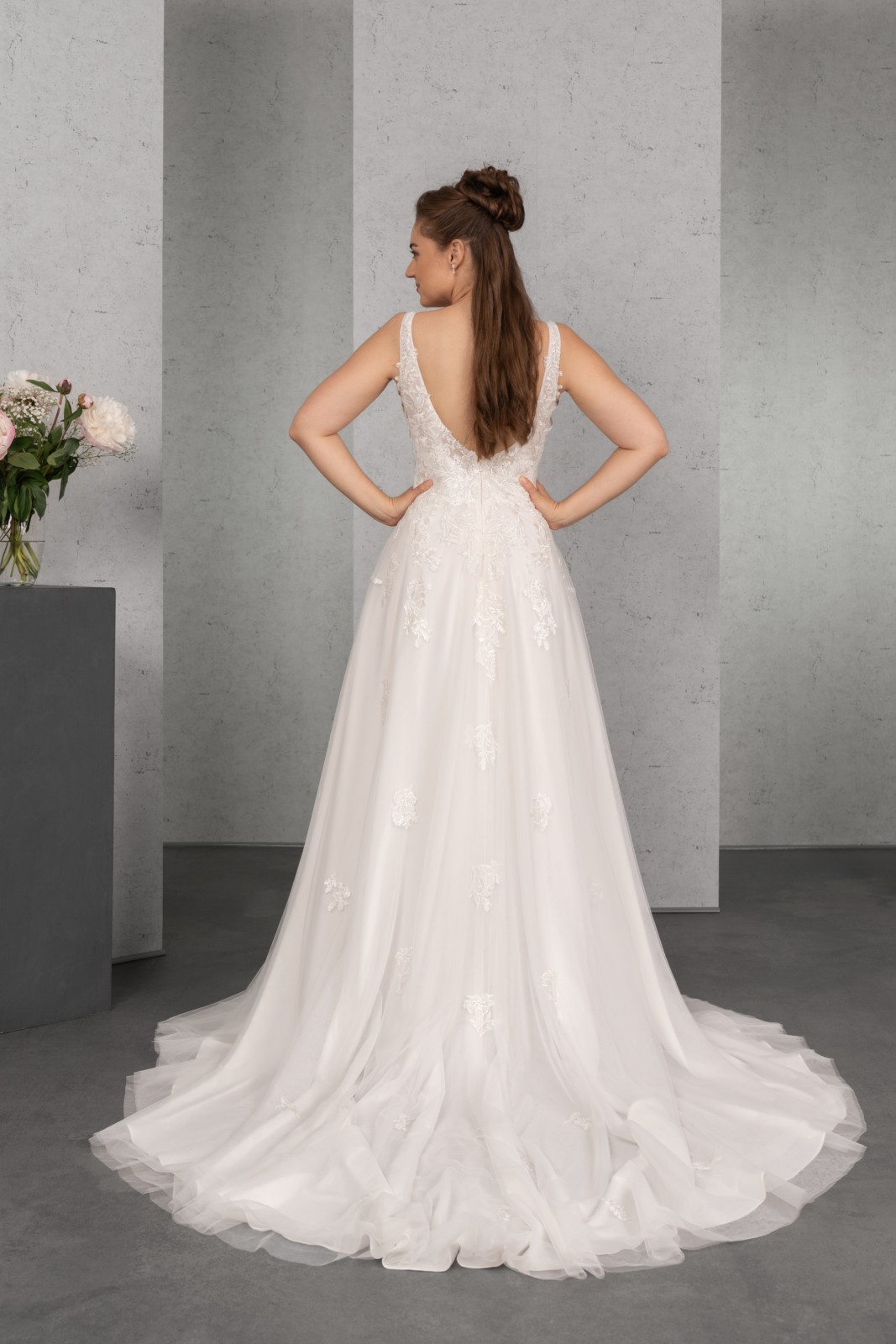 Das aufwendig mit Spitze besetzte Oberteil mit Trägern und tiefem Rücken wird durch die Cut-Out’s vorne und an den Seiten perfekt in Szene gesetzt. Der weite Tüllrock mit Wickelschlitz rundet das Bild harmonisch ab.