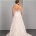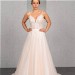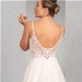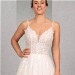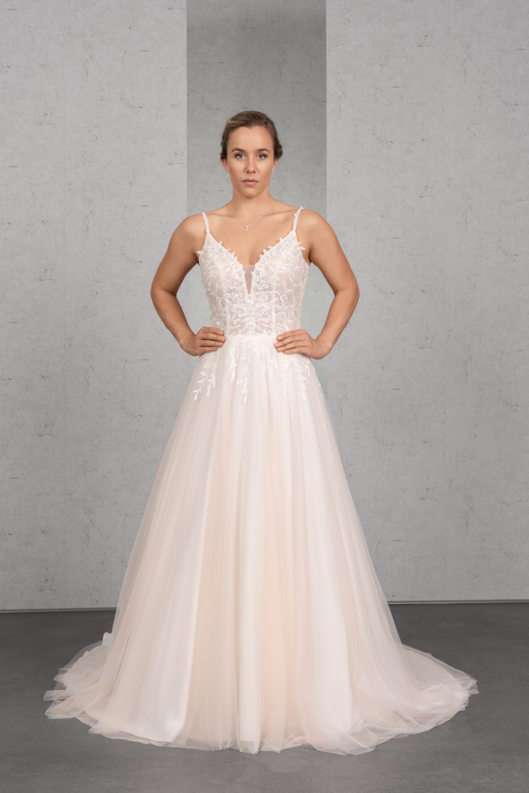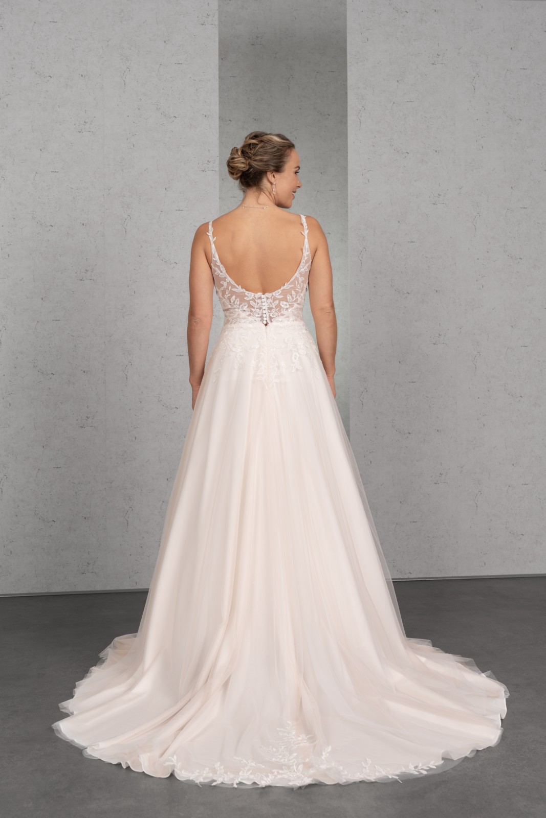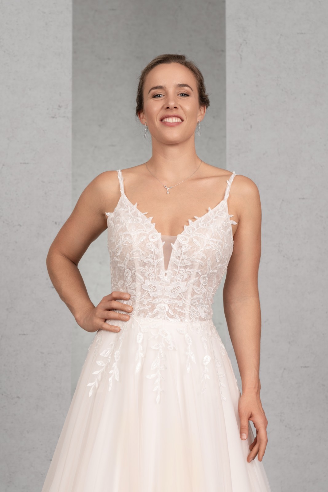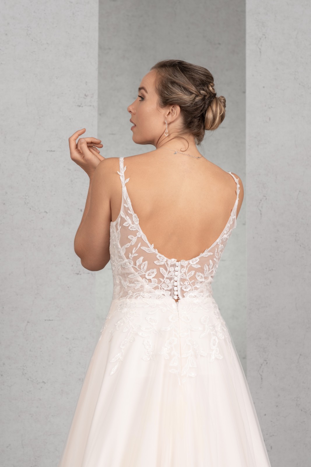 Die zarte blätterförmige Spitze auf dem transparenten Oberteil mit kurzem Cut-Out und tiefem Rücken wiederholt sich auf den schmalen Trägern und dem oberen Rock des bezaubernden Brautkleides. Der weite Tüllrock mit Spitzenbesatz auf der Schleppe rundet den romantischen Look perfekt ab.