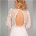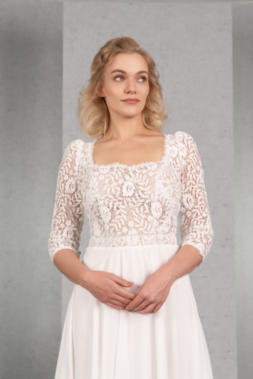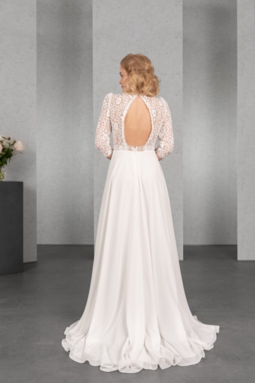 Das transparente Oberteil mit Karree-Ausschnitt und langen Ärmeln wird durch die Spitze aus Blüten und Blätter gekonnt in Szene gesetzt. Eine Spitzenborte betont die Taille und den sensationellen Rückenausschnitt. Vervollständigt wird der Vintage-Look durch einen Rock aus fließendem Chiffon.