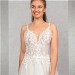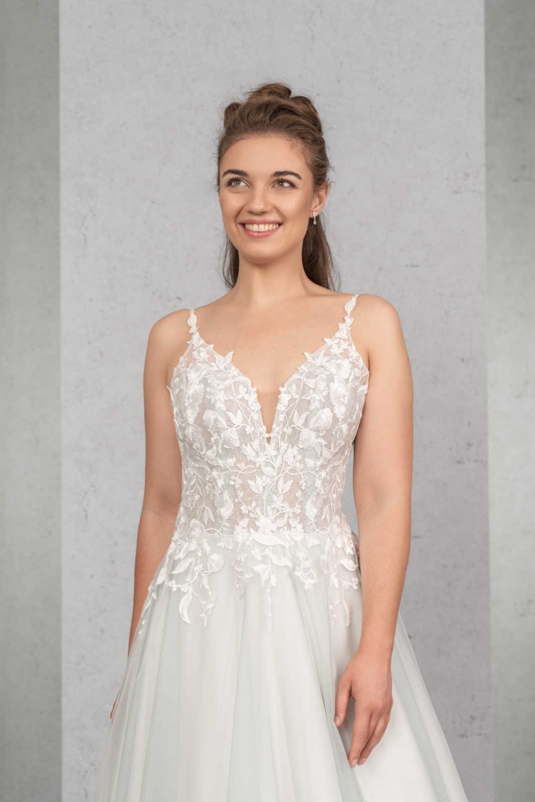 Zarte Spitzenornamente zieren das transparente Oberteil mit kurzem Cut-out und setzen sich auf den schmalen Trägern und dem oberen Rock fort, der Keyhole-Ausschnitt im tiefen Rücken bildet einen weiteren Blickfang. Vervollständigt wird das moderne Brautkleid durch einen weiten Tüllrock mit Kurzschleppe.