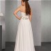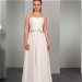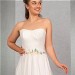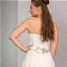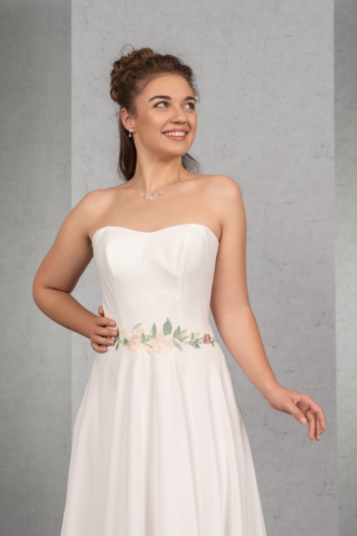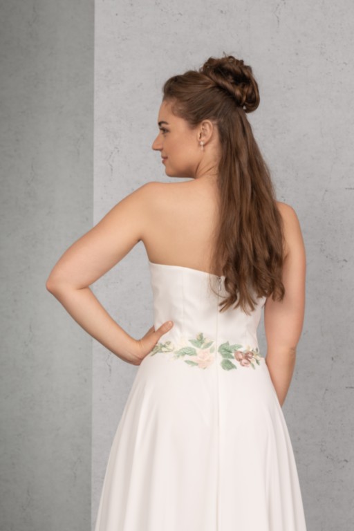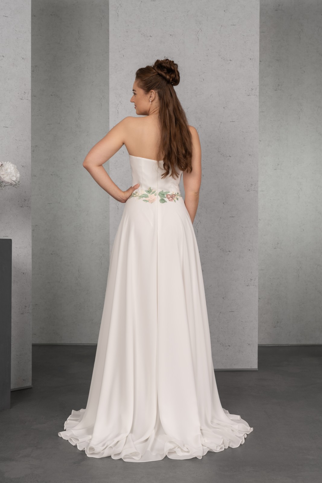 Das schlichte Korsagentop mit sanft geschwungenem Ausschnitt und der weite Rock mit Kurzschleppe aus Chiffon werden durch die farbigen Spitzenapplikationen in der Taille perfekt in Szene gesetzt. Das perfekte Brautkleid für eine Gartenhochzeit.