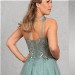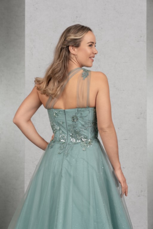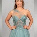 DAS Wahnsinnskleid in der Farbe Salbei für DEN Auftritt: Üppige Pailletten-Applikationen betonen das Top mit sichtbaren Stäbchen und einer raffinierten One-Shoulder Drapierung, die sich im Rücken fortsetzt. Der Rock aus Glitzertüll vervollständigt den extravaganten Look.