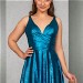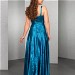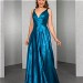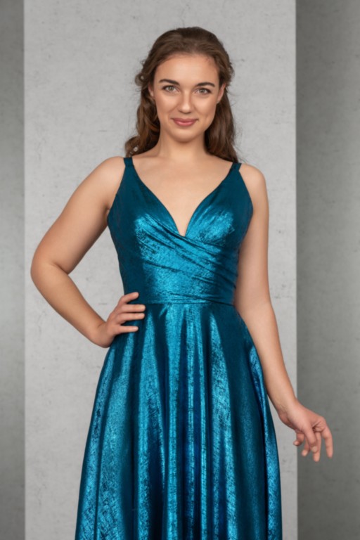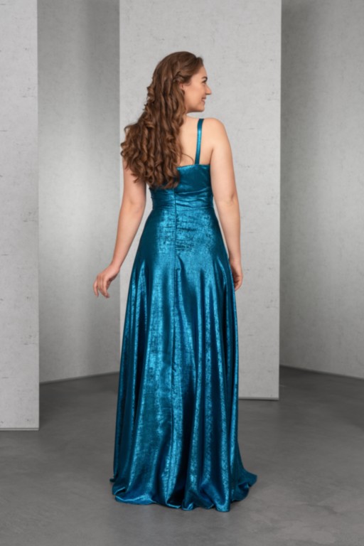 Im Oberteil mit breiteren Trägern und normaler Rückenhöhe zaubern weiche Drapierungen und geschwungene Linien ein wunderschönes Dekolleté. Der ausdrucksstarke Damast sorgt für das gewisse Extra des schlichten Abendkleides in der Farbe Türkis, ein besonderer Clou sind die Seitentaschen im weiten Rock.