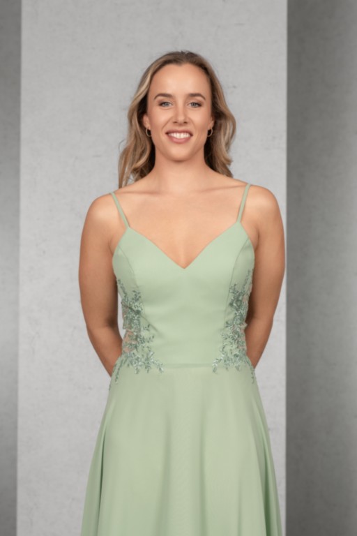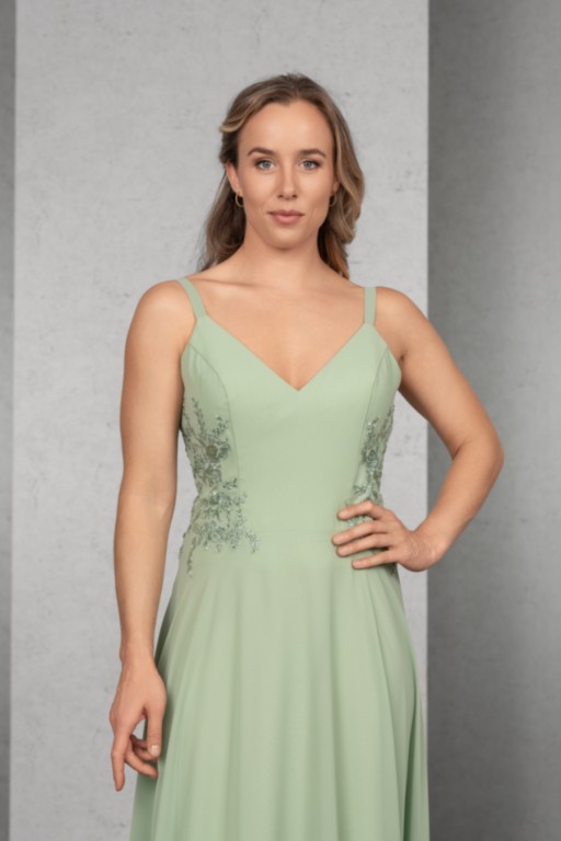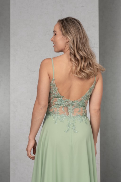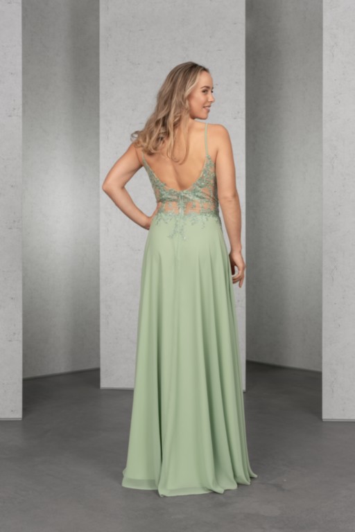 Perlenbestickte zarte Spitze ziert das Top des atemberaubenden Abendkleides in der Farbe Lindgrün, die schmalen Träger und der transparente Rücken sorgen für den WOW-Effekt. Abgerundet wird das Bild durch den weiten Rock aus fließendem Chiffon.