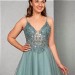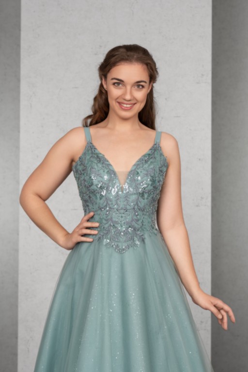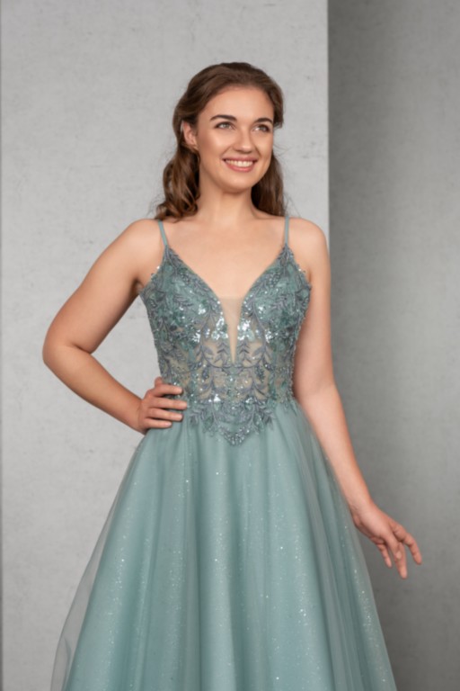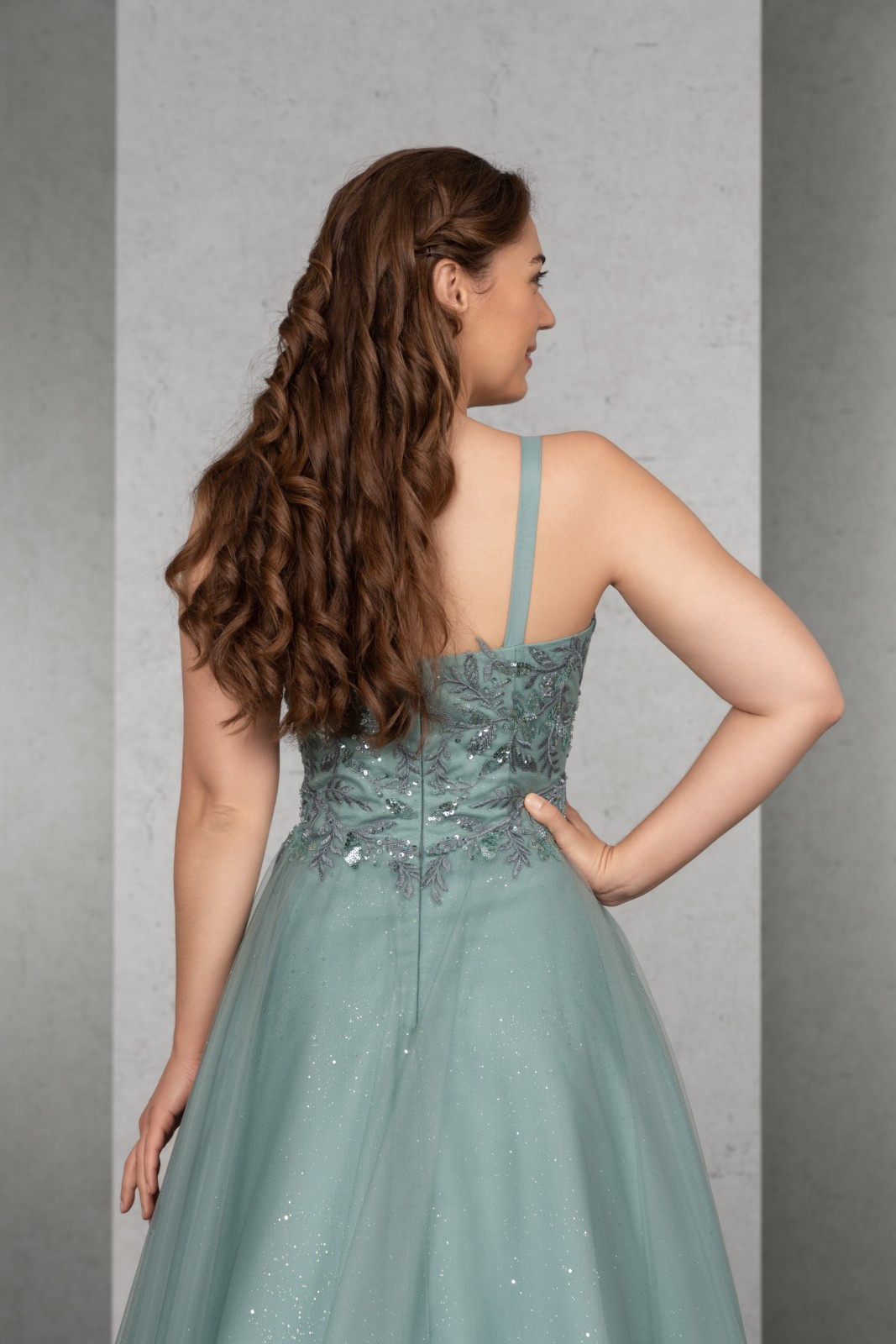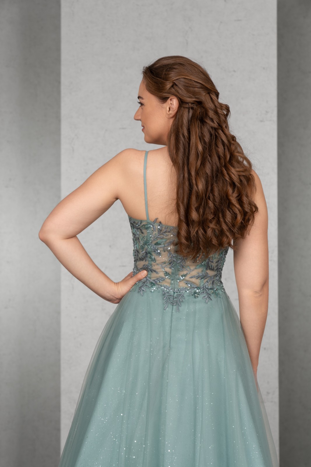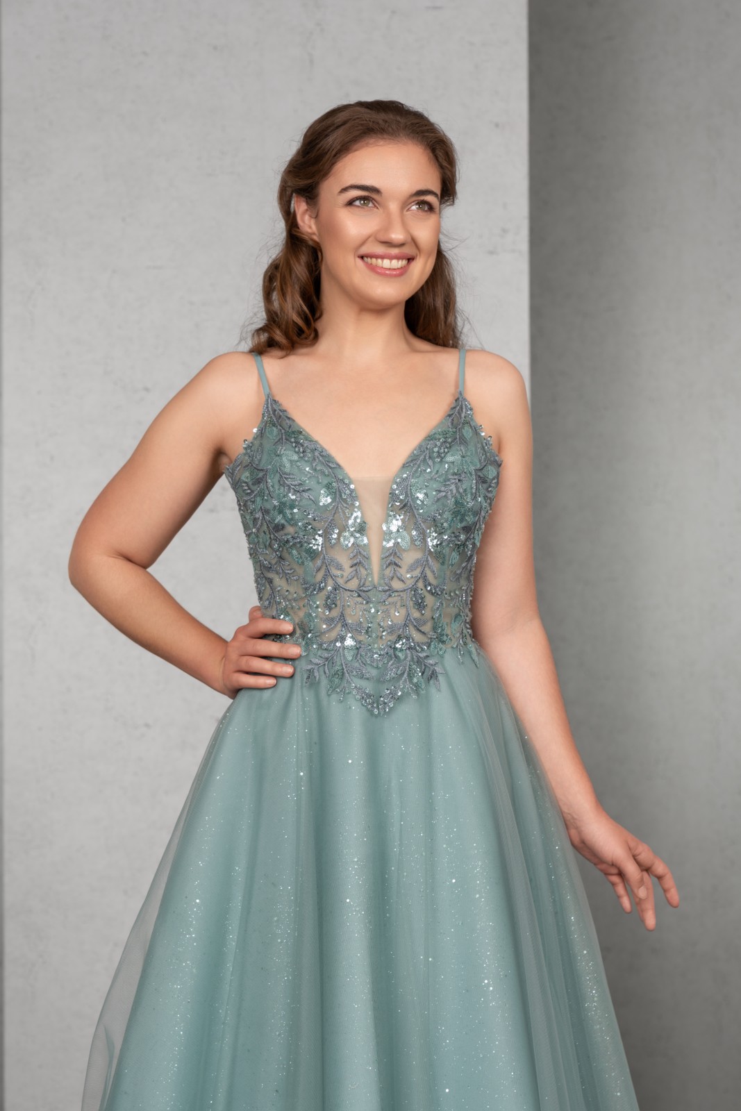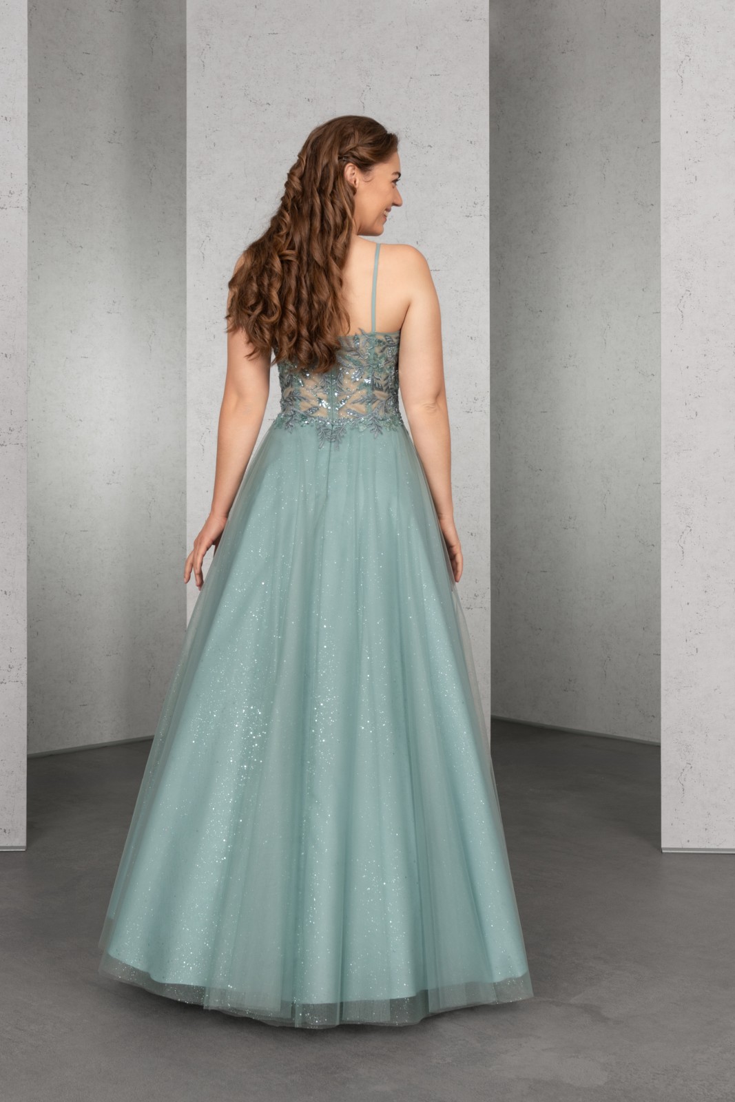 So geht Glitzer. Aufwendige Spitzenapplikationen betonen das transparente Oberteil mit sichtbaren Stäbchen, tiefem Cut-Out und schmalen Trägern. Für den extravaganten Touch sorgt der weite Rock aus Glitzertüll.
