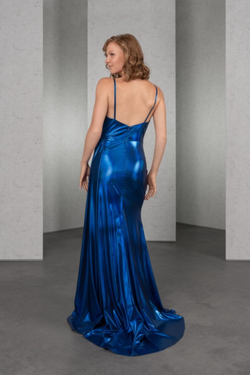 DAS Kleid für den WOW Auftritt! Im Oberteil mit schmalen Trägern und tiefem Rücken zaubern weiche Drapierungen und geschwungene Linien ein wunderschönes Dekolleté. Der ausdrucksstarke Glanzjersey sorgt für das gewisse Extra des Abendkleides in der Farbe Kobalt. Ein besonderer Eye-Catcher ist der hohe Schlitz im schmalen Rock mit Kurzschleppe.