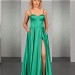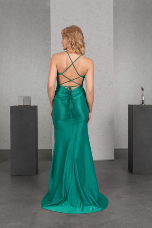Aufgesetzte Stäbchen betonen die Korsage mit schmalen Trägern und der weite Rock mit Seitentaschen und Wickelschlitz vervollständigt das Abendkleid in der Farbe Grün aus weichem Softsatin.