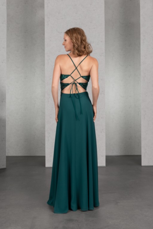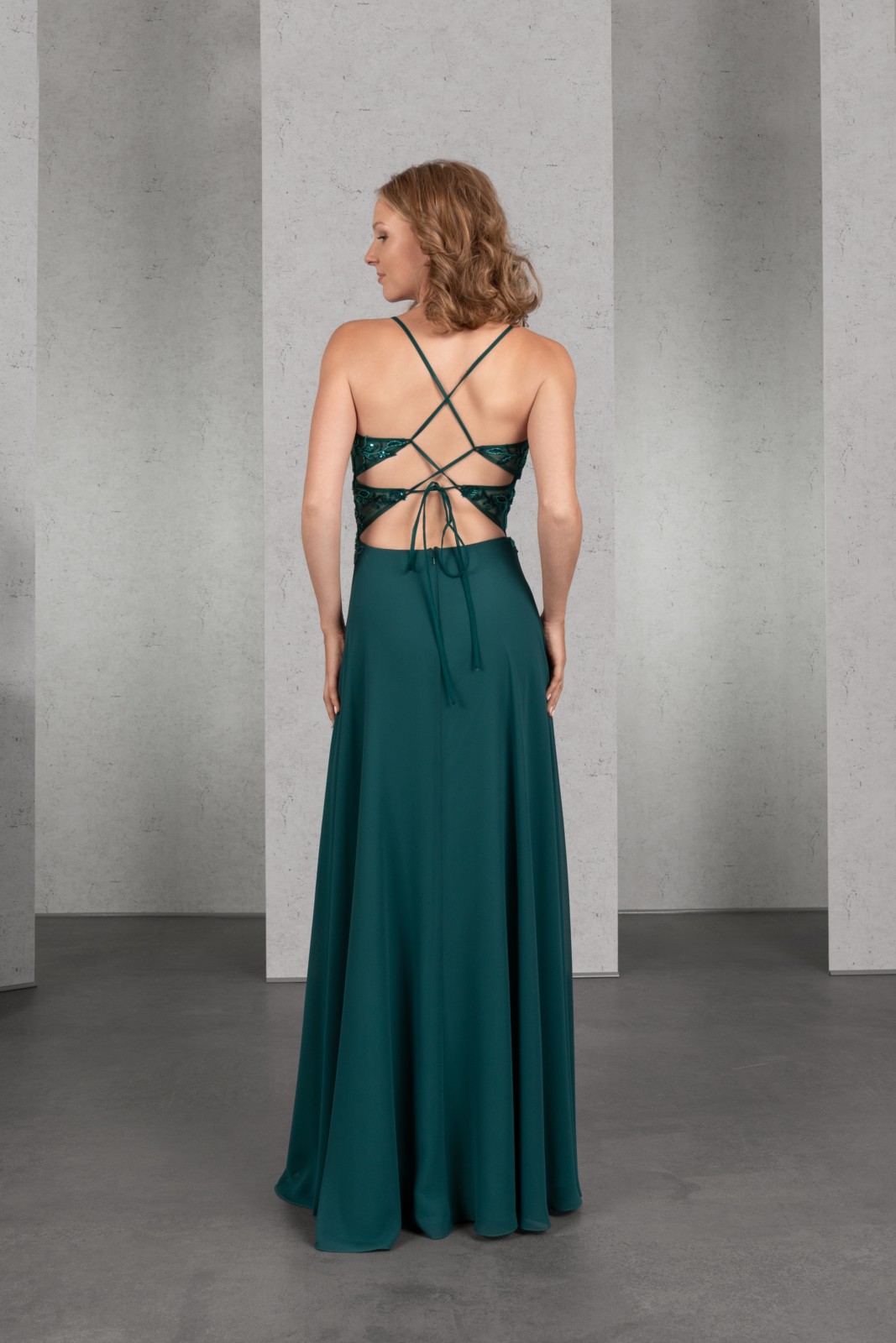 Das transparente Top mit sichtbaren Stäbchen und tiefem Cut-Out ist mit perlenbestickter Spitze besetzt, die schmalen Träger unterstreichen den zarten Look. Vervollständigt wird das aufregende Abendkleid in der Farbe Dunkelgrün durch einen weiten Rock aus fließendem Chiffon.
