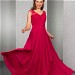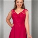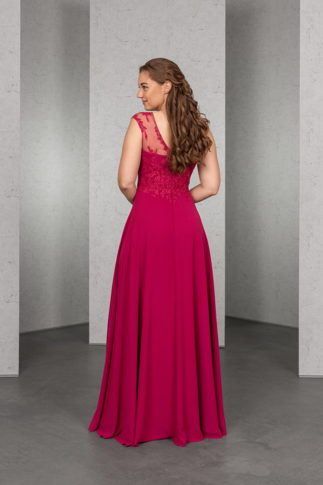 Zarte Spitzen zieren das Oberteil mit leicht überschnittener Schulter und weichem V-Ausschnitt. Ein kaschierendes Faltenelement im weiten Rock aus Chiffon rundet das klassische Abendkleid in der Farbe Cranberry perfekt ab.