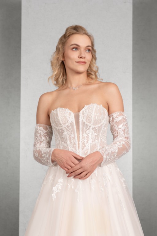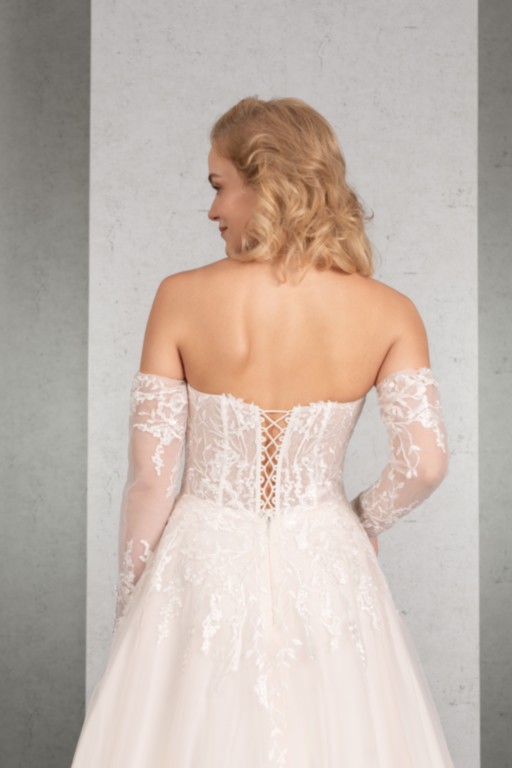 Das transparente Top mit taillentiefem Cut-Out und sichtbaren Stäbchen ist aufwendig mit perlenbestickter Spitze besetzt. Die abnehmbaren langen Ärmel und der geschnürte Rücken sind ein besonderer Blickfang, der weite Tüllrock vervollständigt das romantische Brautkleid perfekt.