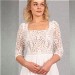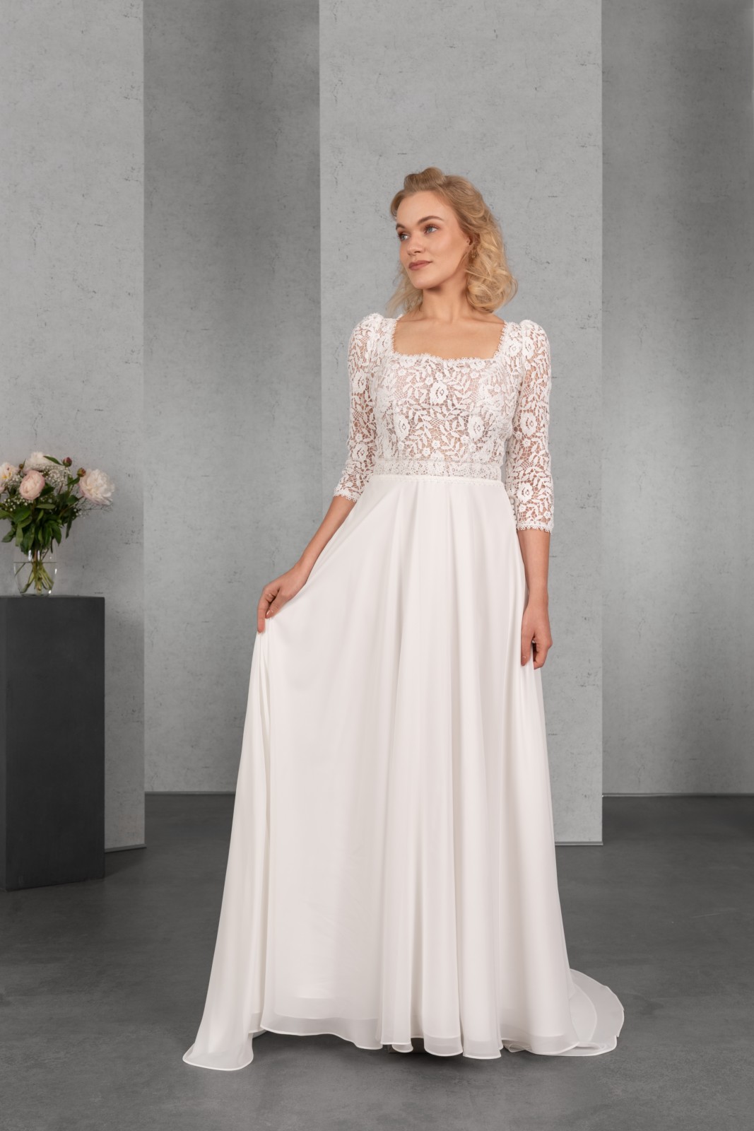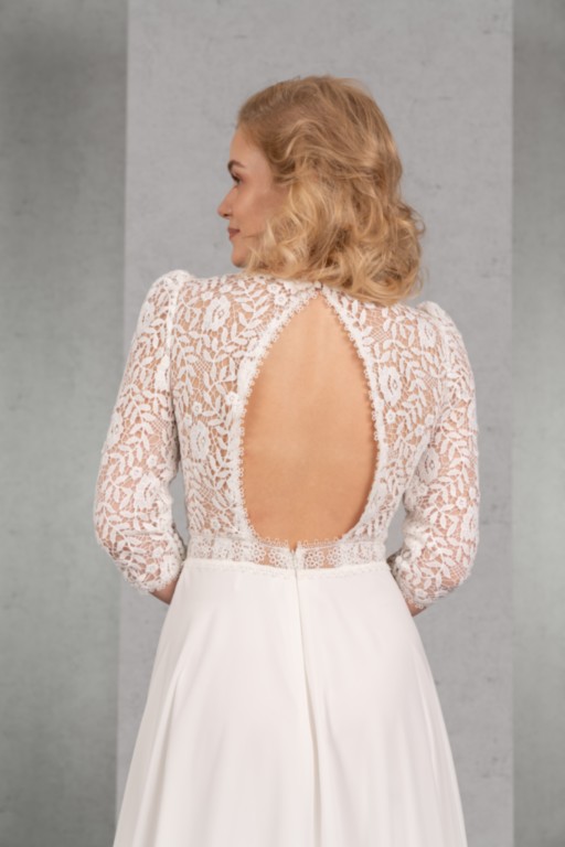 Das transparente Oberteil mit Karree-Ausschnitt und langen Ärmeln wird durch die Spitze aus Blüten und Blätter gekonnt in Szene gesetzt. Eine Spitzenborte betont die Taille und den sensationellen Rückenausschnitt. Vervollständigt wird der Vintage-Look durch einen Rock aus fließendem Chiffon.
