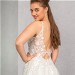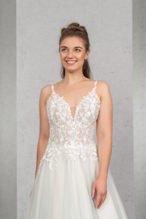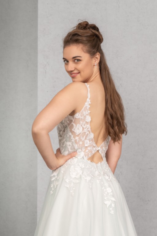 Zarte Spitzenornamente zieren das transparente Oberteil mit kurzem Cut-out und setzen sich auf den schmalen Trägern und dem oberen Rock fort, der Keyhole-Ausschnitt im tiefen Rücken bildet einen weiteren Blickfang. Vervollständigt wird das moderne Brautkleid durch einen weiten Tüllrock mit Kurzschleppe.