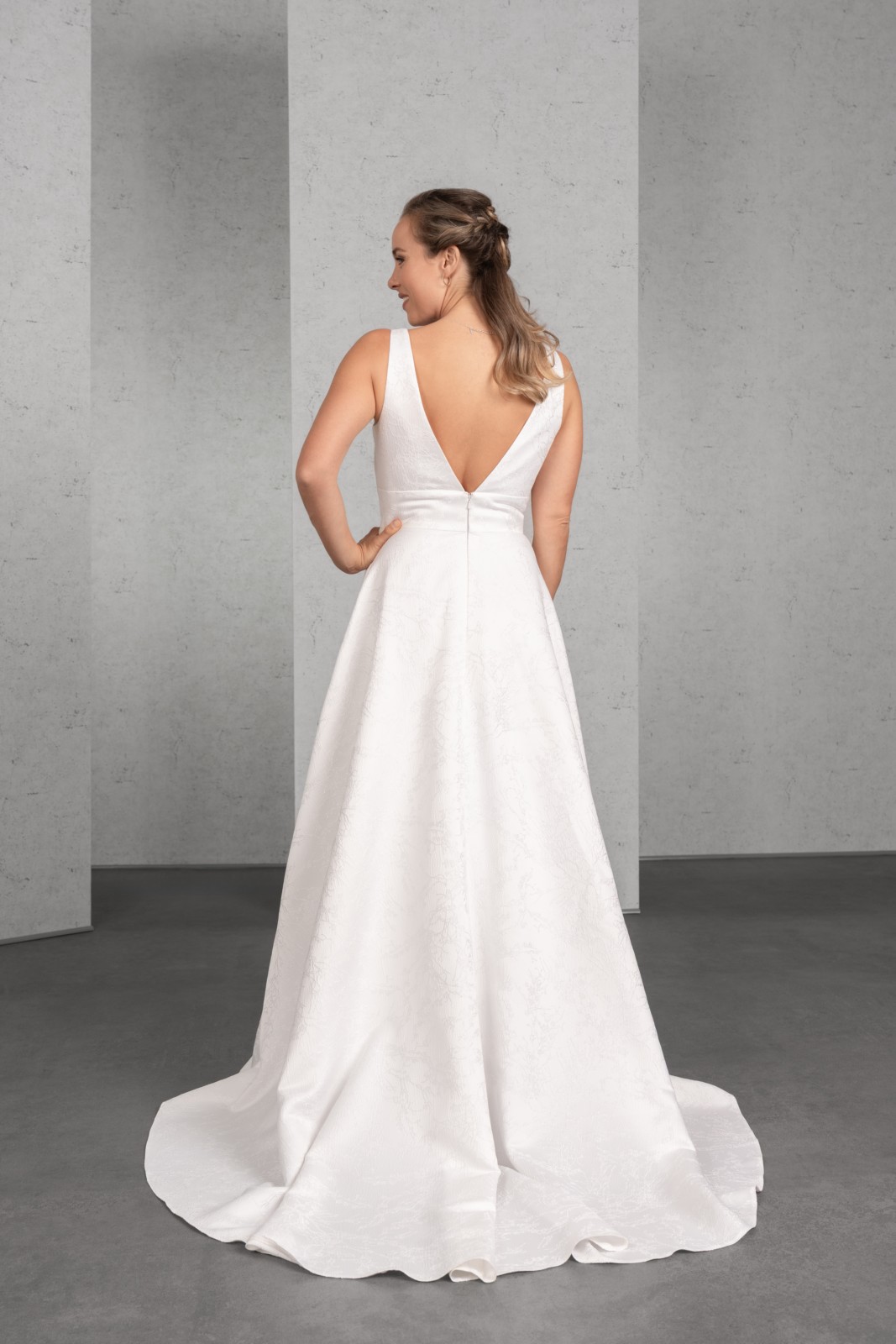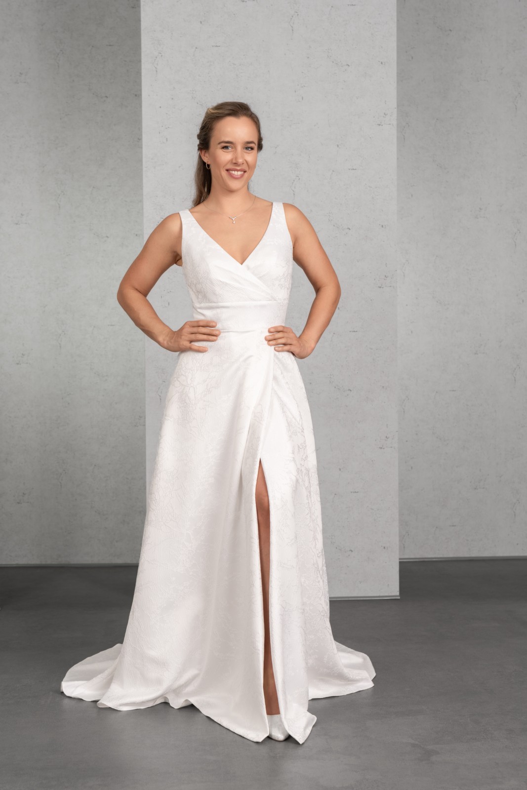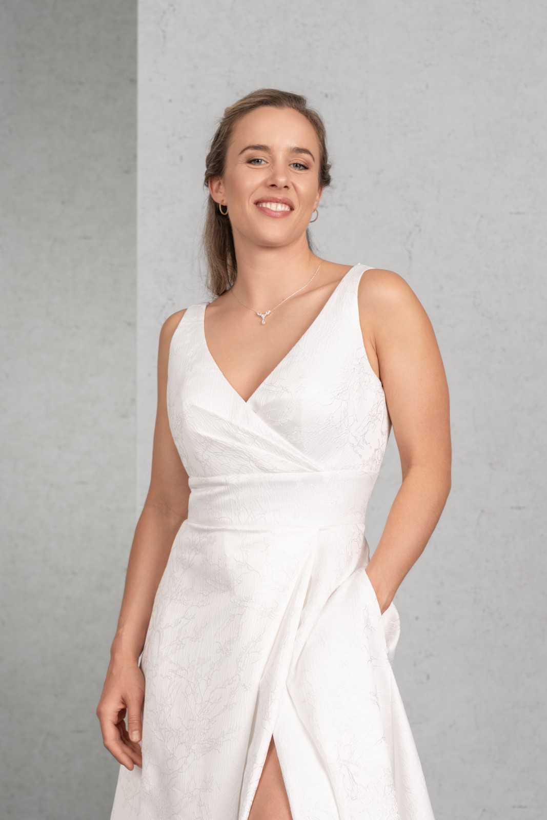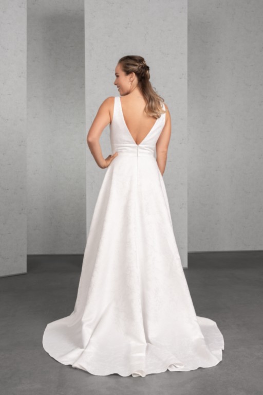 Ausdrucksstarker Jacquard unterstreicht den figurfreundlichen Schnitt dieses umwerfenden Brautkleides. Eine breite Passe in der Taille betont das Top mit breiteren Trägern und tiefem Rücken, der weite Wickelrock mit Seitentaschen und Kurzschleppe bildet den perfekten Abschluss.