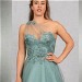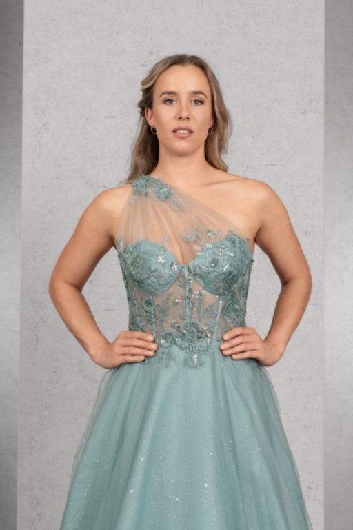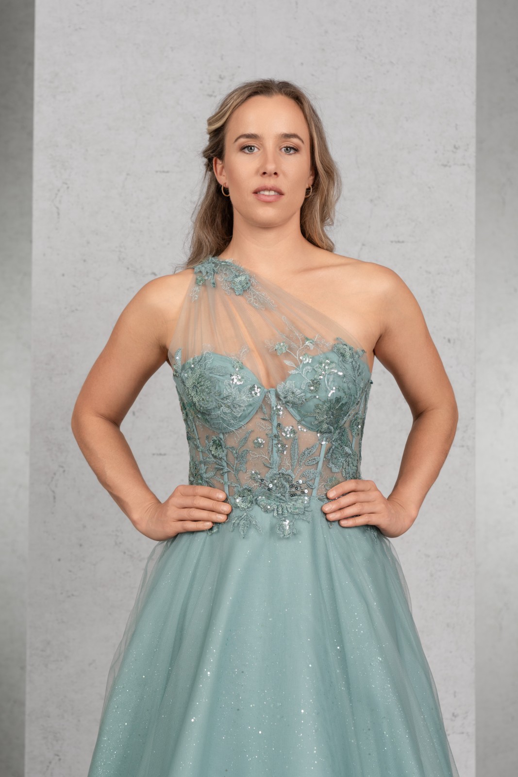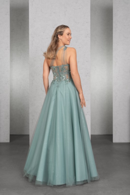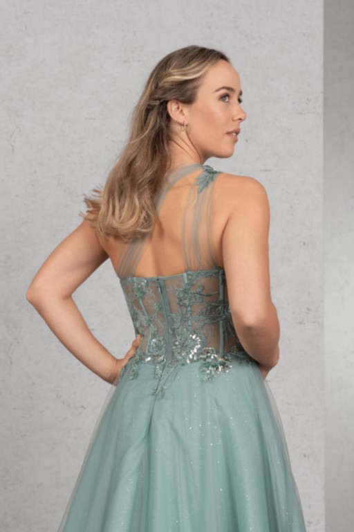 DAS Wahnsinnskleid in der Farbe Salbei für DEN Auftritt: Üppige Pailletten-Applikationen betonen das Top mit sichtbaren Stäbchen und einer raffinierten One-Shoulder Drapierung, die sich im Rücken fortsetzt. Der Rock aus Glitzertüll vervollständigt den extravaganten Look.