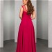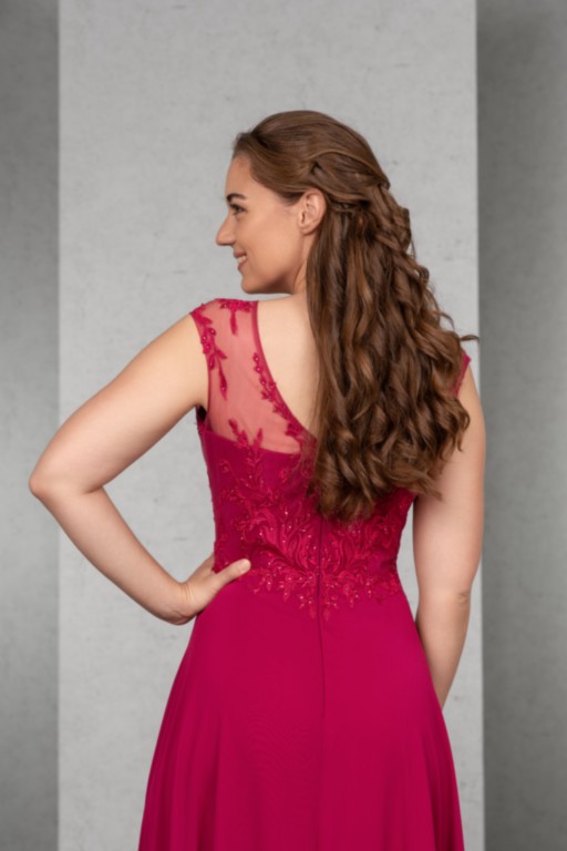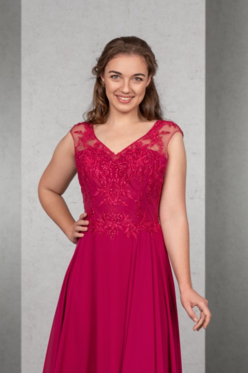 Zarte Spitzen zieren das Oberteil mit leicht überschnittener Schulter und weichem V-Ausschnitt. Ein kaschierendes Faltenelement im weiten Rock aus Chiffon rundet das klassische Abendkleid in der Farbe Cranberry perfekt ab.